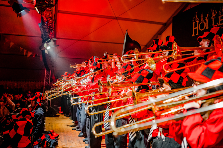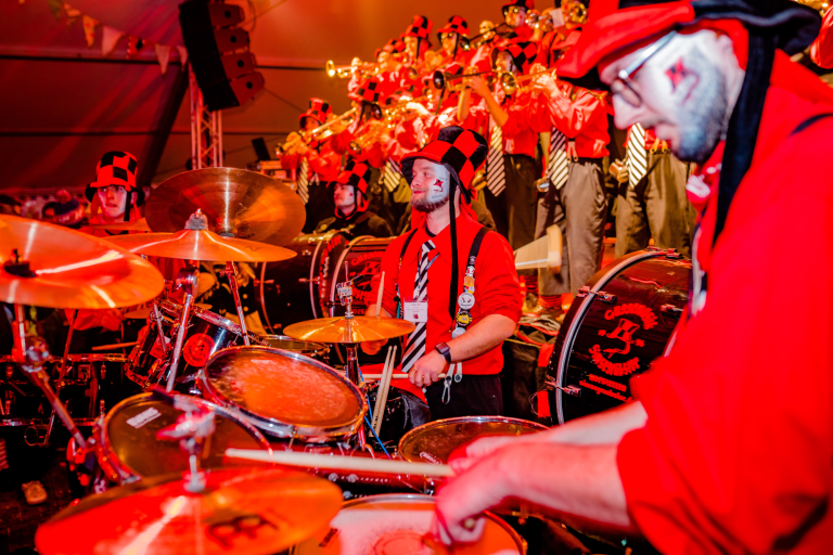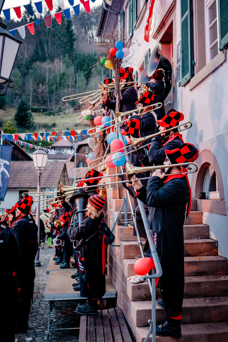 Die Zeit nahm ihren Lauf und die wilden 90er brachen an. Gruppen wie „2 Unlimited“ und „Ace of Base“ beherrschten den Musikmarkt. Die Bundespost führte die neuen 5-stelligen Postleitzahlen in Deutschland ein und in 77716 Hofstetten wurde am 06.07.1993 die Narrenzunft der Höllenhunde gegründet. Die 14 Gründungsmitglieder traten zu ihren ersten Umzügen an und merkten dabei, dass dies mit lautstarker Musik viel besser funktioniert. So kam im Frühjahr 1994 die Vorstandschaft der Höllenhunde mit der Bitte auf uns zu, einige Umzüge mit unserer Musik zu begleiten. Wir waren Feuer und Flamme von der Idee, schlossen uns den Höllenhunden an. Anfangs noch als „Homberle“ oder „Hemdglunker“ verkleidet, unterhielten wir unser Publikum mit Klassikern wie „Mamorstein“, „Ramba Zamba“ oder natürlich „Tränen lügen nicht“ unter der Leitung von Peter Neumaier. Dieser hatte bereits die Truppe beim Kindergarten-Umzug angeführt und hatte somit die nötige Kompetenz in Sachen Fasentsmusik.